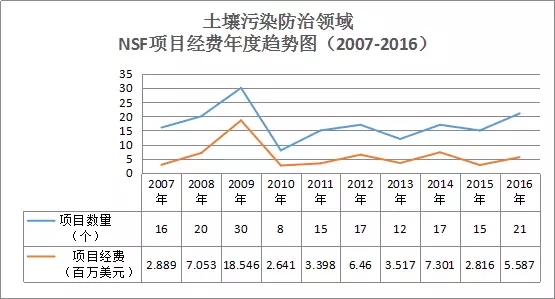 通過項目數(shù)據(jù)分析(見圖12),在土壤污染防治領(lǐng)域,美國國家科學(xué)基金資助經(jīng)費在2007年至2009年呈現(xiàn)了穩(wěn)步遞增的趨勢,2009年項目數(shù)量達到峰值30個。2010年出現(xiàn)拐點,項目數(shù)量下降為8個,2011年又開始回升,之后5年一直較為平穩(wěn),2016年有所增加,達到21個。