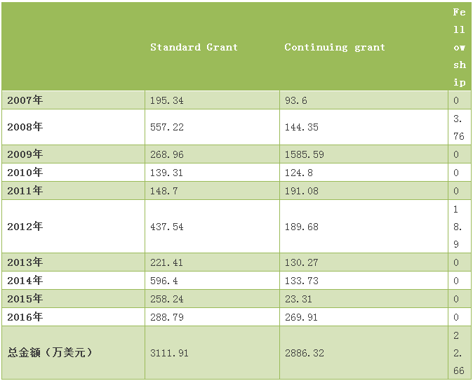 表8 美國國家科學(xué)基金項目資助類型經(jīng)費表(2007-2016年)