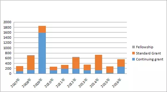 圖12:美國國家科學(xué)基金項目資助經(jīng)費年度趨勢圖(2007-2016)