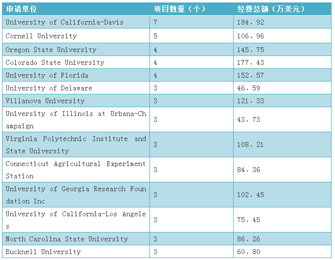 根據(jù)統(tǒng)計,本領(lǐng)域申請年份在2007年至2016年間,共有135個機構(gòu)申請了美國國家科學(xué)基金。其中申請數(shù)量超過2個的機構(gòu)有14個獲得經(jīng)費約為1496.8萬美元,如表9所示。