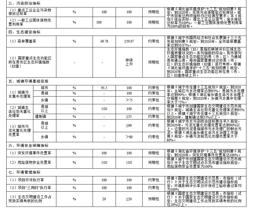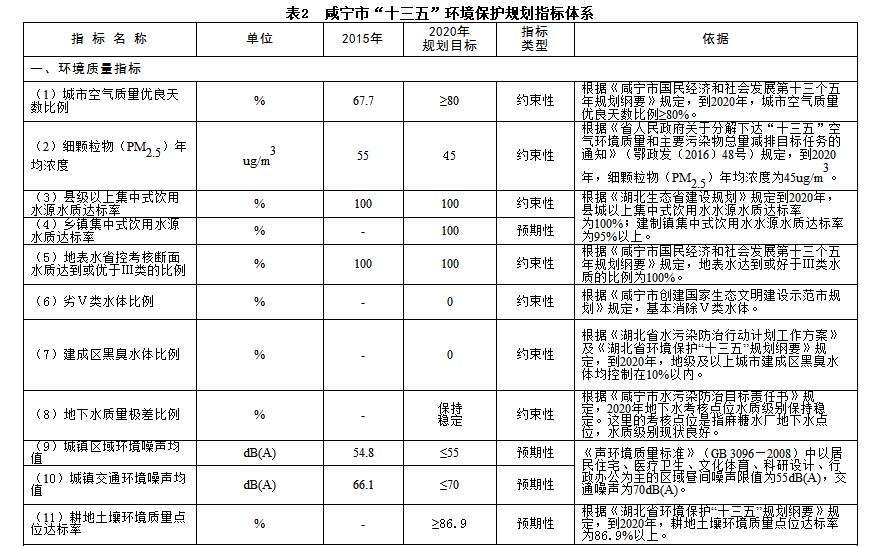 根據(jù)國家、省環(huán)境保護“十三五”規(guī)劃相關要求,結合咸寧實際情況,“十三五”期間環(huán)保規(guī)劃指標如下。
