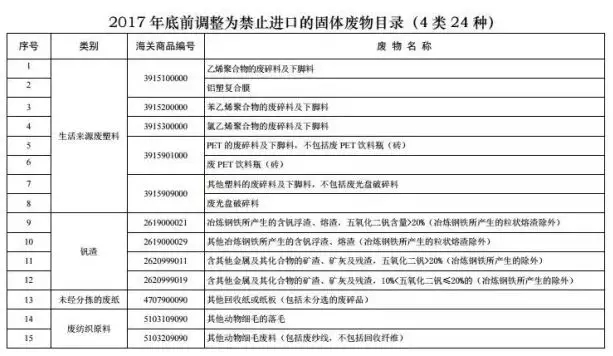 決定禁止進(jìn)口的“洋垃圾”有4大類(lèi)共24種,分別是來(lái)自生活源的廢塑料(8種)、未經(jīng)分揀的廢紙(1種)、廢紡織品原料(11種)和釩渣(4種)。這一進(jìn)口禁令已經(jīng)從去年12月31日起執(zhí)行。