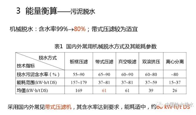 接下來(lái)我們看一下計(jì)算結(jié)果。大家知道,機(jī)械脫水有各種各樣的方法,99%~80%,這里列了很多技術(shù)與設(shè)備,我也不一一匯報(bào)了。常見(jiàn)的是帶式壓濾機(jī),能達(dá)到80%含水率的要求,所以,我們就以帶式壓濾機(jī)為例進(jìn)行計(jì)算,大概耗能折合成干固體每噸是60千瓦小時(shí),即,60度電。熱干化,也就是從80%~40%,我知道搞干化設(shè)備的人有很多,到40%以后基本上就可以自持燃燒了。干化的時(shí)候輸入熱能進(jìn)行蒸發(fā),所需熱量一個(gè)是用于污泥中水分升溫繼而蒸發(fā)的熱量,還有就是污泥升溫的熱量。