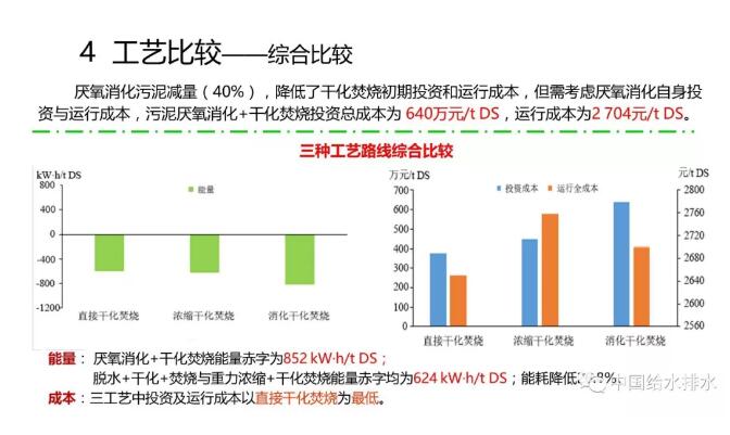 最后,把我們推薦工藝與重力濃縮后再機(jī)械脫水、干化焚燒工藝,以及傳統(tǒng)厭氧消化后干化焚燒工藝進(jìn)行一下比較。直接干化焚燒能量消耗是最小的。從投資和運(yùn)行成本來(lái)看,無(wú)論是投資成本、運(yùn)行費(fèi)用,在這三個(gè)比較中都是最低的。