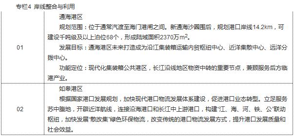 推進(jìn)岸線整合與利用。提升開發(fā)利用區(qū)岸線使用效率,合理安排港口岸線、過江通道岸線、取排水口岸線??刂葡嚓P(guān)企業(yè)無序占用岸線,推進(jìn)公共碼頭建設(shè)。港口工業(yè)生產(chǎn)岸線騰退轉(zhuǎn)移,生活、生態(tài)岸線空間穩(wěn)步增加,實(shí)現(xiàn)“三生”空間有序發(fā)展,統(tǒng)籌重要過江通道岸線的控制預(yù)留。加快沿江原南通港區(qū)、任港港區(qū)、狼山港區(qū)、富民港區(qū)以及江海港區(qū)的分期轉(zhuǎn)移和整合,形成沿江五港區(qū)的總體格局。嚴(yán)控新增港口岸線利用,取消或調(diào)整與水源保護(hù)、生態(tài)紅線區(qū)域等有沖突的港口碼頭。對一些開發(fā)布局不合理、未按國家有關(guān)規(guī)定、不符合規(guī)劃的開發(fā)利用項(xiàng)目逐步加以糾正。對涉及岸線利用的各類違法違規(guī)行為,重點(diǎn)清理整頓,逐步消除存量,堅(jiān)決遏制增量。依法取締不具備安全生產(chǎn)條件、不符合環(huán)境保護(hù)要求的非法碼頭和裝卸點(diǎn),到2020年,沿江非法碼頭徹底消除。建立健全長江岸線保護(hù)和開發(fā)利用協(xié)調(diào)機(jī)制,統(tǒng)籌岸線與后方土地的使用和管理。探索建立岸線資源有償使用制度。