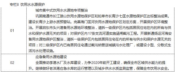 深入推進(jìn)飲用水水源地環(huán)境保護(hù)執(zhí)法專項(xiàng)行動(dòng),加大集中式飲用水水源地保護(hù)區(qū)內(nèi)違章建設(shè)項(xiàng)目的清拆力度,依法查處保護(hù)區(qū)內(nèi)的違法行為。鞏固狼山飲用水水源地環(huán)境問題整治成果,逐步搬遷飲用水源地二級保護(hù)區(qū)內(nèi)集裝箱及散貨專業(yè)碼頭。排查和依法取締飲用水水源保護(hù)區(qū)內(nèi)的排污口以及影響水源地保護(hù)的碼頭,實(shí)施水源地及周邊區(qū)域環(huán)境綜合整治。定期調(diào)查評估集中式地下水型飲用水水源補(bǔ)給區(qū)環(huán)境狀況。依法劃定飲用水水源地保護(hù)區(qū),定期開展縣級以上集中式飲用水水源地環(huán)境狀況調(diào)查評估,按照“水量保證、水質(zhì)達(dá)標(biāo)、應(yīng)急保障”的要求,加強(qiáng)飲用水水源地及應(yīng)急備用水源達(dá)標(biāo)建設(shè)。對未達(dá)到Ⅲ類水質(zhì)要求的飲用水水源要制定并實(shí)施水質(zhì)達(dá)標(biāo)方案。加強(qiáng)飲用水水源風(fēng)險(xiǎn)防控體系建設(shè),進(jìn)一步優(yōu)化沿江取水口和排污口布局。強(qiáng)化對水源周邊可能影響水源安全的制藥、化工、造紙、制革、印染、電鍍、農(nóng)藥等重點(diǎn)行業(yè)企業(yè)的執(zhí)法監(jiān)管。推進(jìn)水廠加速提標(biāo)擴(kuò)能,組織實(shí)施狼山水廠深度處理改造,實(shí)現(xiàn)供好水向供優(yōu)質(zhì)水轉(zhuǎn)變。到2020年,全市基本實(shí)現(xiàn)“雙源供水”。