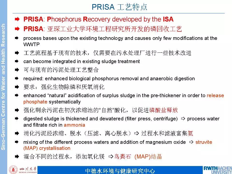 PRISA工藝是從污泥處理過程中產(chǎn)生的工藝水中回收磷(一次濃縮池上清液、厭氧消化池上清液、二次濃縮池上清液)。這三種工藝水中含磷的形態(tài)不一樣。經(jīng)過一定的化學(xué)處理之后,回收到是大家都非常熟悉的MAP。該回收工藝基于現(xiàn)有的污水處理工藝,僅需要在污水處理廠進(jìn)行一些技術(shù)改進(jìn),與現(xiàn)有的污泥處理工藝整合。該回收工藝對(duì)污水處理工藝要求,必須采用強(qiáng)化生物除磷工藝,否則污泥處理過程的工藝水中的磷的含量就比較低,就不太適合PRISA回收工藝。磷回收率要大于50%,滿足德國(guó)新"污泥條例"對(duì)于磷回收率的要求。