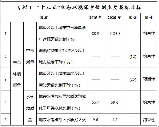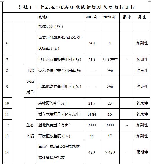 ——環(huán)境質(zhì)量控制目標指標。到2020年,大氣環(huán)境質(zhì)量方面,地級及以上城市空氣質(zhì)量全年達標天數(shù)比例平均達到83.8%以上,重度及以上污染天數(shù)比例下降25%,未達標地級及以上城市PM2.5年均濃度下降12%。水環(huán)境質(zhì)量方面,全區(qū)地表水質(zhì)量考核斷面水質(zhì)達到或優(yōu)于Ⅲ類比例總體達到59.6%,劣Ⅴ類水質(zhì)比例控制在3.8%,重要江河湖泊水功能區(qū)水質(zhì)達標率達到71%,全區(qū)地下水質(zhì)量考核點位水質(zhì)級別保持穩(wěn)定且極差比例控制在21.3%。土壤環(huán)境質(zhì)量方面,全區(qū)土壤環(huán)境質(zhì)量總體保持穩(wěn)定,農(nóng)用地和建設用地土壤環(huán)境安全得到基本保障,受污染耕地安全利用率和污染地塊安全利用率均達到90%以上。生態(tài)環(huán)境質(zhì)量方面,森林覆蓋率達23%,活立木蓄積量達16億立方米,濕地保有量達9000萬畝,草原植被蓋度達到45%,重點生態(tài)功能區(qū)所屬縣域生態(tài)環(huán)境狀況指數(shù)達到48.9以上。