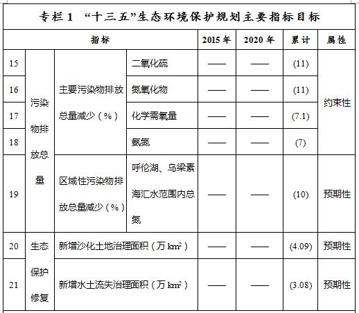 ——污染物排放總量控制目標。到2020年,全區(qū)化學需氧量、氨氮、二氧化硫和氮氧化物排放總量分別控制在77.66萬噸、4.37萬噸、109.56萬噸和101.37萬噸以內(nèi),比2015年的83.56萬噸、4.69萬噸、123.09萬噸和113.88萬噸分別減少7.1%、7%、11%和11%。呼倫湖、烏梁素海匯水范圍內(nèi)總氮減少10%。