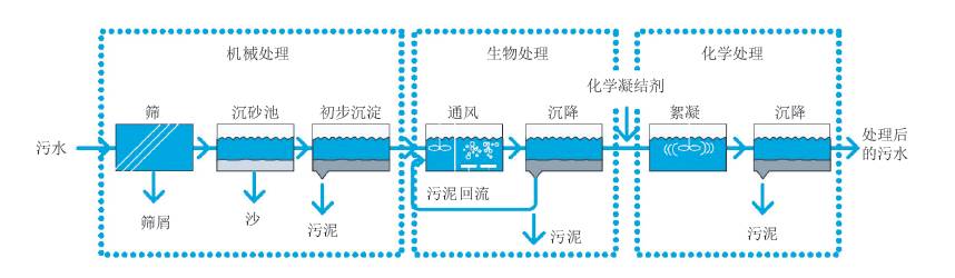在20世紀60年代至70年代,瑞典修建了更多現(xiàn)代化的污水處理廠之后,極大地減少了磷和有機物的排放量。近十年來,磷和生化需氧量的處理水平保持在95%左右。另一方面,自2010年起,瑞典的平均氮凈化水平一直維持在60%左右(瑞典環(huán)保署,2014)。從20世紀80年代中期開始,增加了一些新的凈化方法,確實大幅提高了較大污水處理廠向氮敏感受體排放的氮的凈化水平。污水處理廠的處理過程如圖。