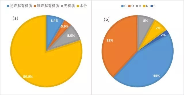 污泥常被認(rèn)為擁有巨大的資源化潛力。然而,無(wú)論從產(chǎn)量還是品質(zhì)上,污泥資源化潛力遠(yuǎn)不如生活垃圾、農(nóng)林廢棄物等大宗廢物。據(jù)國(guó)家統(tǒng)計(jì)局?jǐn)?shù)據(jù),2016年,我國(guó)生活垃圾清運(yùn)量達(dá)2.0億噸,而市政污泥產(chǎn)生量約4000萬(wàn)噸(以80%含水率的脫水污泥計(jì)),扣除水分后,干固體僅800萬(wàn)噸。我國(guó)污泥有機(jī)質(zhì)含量普遍偏低,一般為30~60%,這意味著前述干固體中還有大量缺乏資源化價(jià)值的無(wú)機(jī)質(zhì)。雖然這些無(wú)機(jī)質(zhì)可以用于制建材,但這種方式更適宜稱為廢棄物消納而非資源化利用。有機(jī)質(zhì)中,難以生物降解的木質(zhì)纖維素含量約14~30%,腐殖酸含量約10~15%,它們的存在進(jìn)一步降低了污泥生物轉(zhuǎn)化能源的效率。以污泥有機(jī)質(zhì)含量60%為例,脫水污泥成分可以用圖1(a)概括。從污泥干固體元素組成看,其碳含量相遠(yuǎn)低于生物質(zhì)廢物。根據(jù)對(duì)幾十座南方污水廠污泥性質(zhì)的調(diào)查,其平均元素組成如圖1(b)所示,其中碳元素作為多種資源化處理技術(shù)的利用對(duì)象,其比例僅45%。從污泥有機(jī)物組成看,蛋白質(zhì)是主要成分,但其含量不超過(guò)50%,其次是多糖、腐殖酸、脂類(lèi)等。