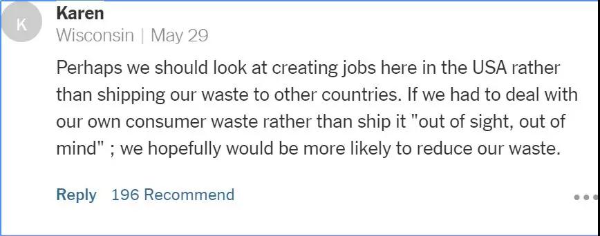 “我們應(yīng)該致力于在美國國內(nèi)創(chuàng)造更多的垃圾處理相關(guān)的就業(yè)崗位,而不是把垃圾轉(zhuǎn)運到其他國家。如果我們能意識到自行處理垃圾是件多么困難的事情的話,我們的浪費也就自然而然減少了。”