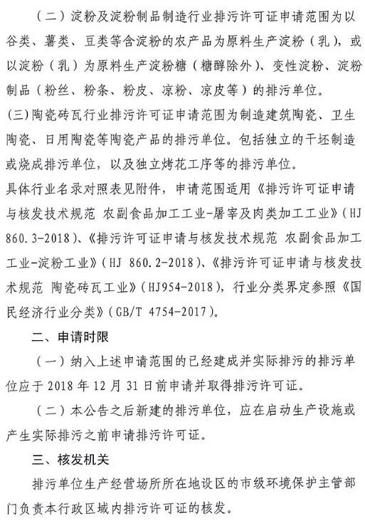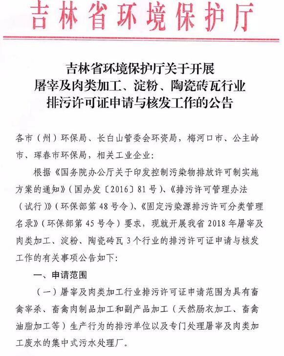 根據(jù)《國(guó)務(wù)院辦公廳關(guān)于印發(fā)控制污染物排放許可制實(shí)施方案的通知》(國(guó)辦發(fā)【2016】81號(hào))、《排污許可管理辦法試行》(環(huán)保部第48號(hào)令)、《固定污染源排污許可分類(lèi)管理名錄》(環(huán)保部第45號(hào)令)要求,吉林省現(xiàn)開(kāi)展2018年屠宰及肉類(lèi)加工、淀粉、陶瓷磚瓦3個(gè)行業(yè)的排污許可證申請(qǐng)與核發(fā)工作。詳情如下: