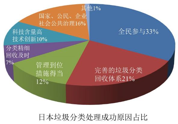 日本的垃圾分類經(jīng)過四十多年的發(fā)展,至今已擁有了成熟的市場機制、完善的法律體系和完整的回收產(chǎn)業(yè)鏈,日本垃圾處理成功的關(guān)鍵與全民參與、完善的回收體系、管理措施、企業(yè)的技術(shù)創(chuàng)新以及政府主導密切相關(guān)(見餅狀圖),也正因如此,日本在循環(huán)經(jīng)濟領(lǐng)域一直走在世界前列。