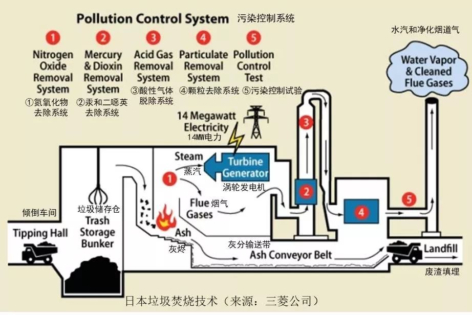 日本的垃圾處理技術(shù)主要包括生產(chǎn)廢棄物固體燃料以及垃圾生物降解,80%的生活垃圾通過焚燒處理,填埋僅占1.3%,其它部分通過破碎、分選等方式處理。日本是目前生活垃圾焚燒技術(shù)最先進的國家,垃圾焚燒廠的數(shù)量位居世界第一,焚燒爐型主要有爐排爐(下圖是以三菱公司為代表的焚燒技術(shù)路線)、流化床焚燒爐和氣化熔融爐。