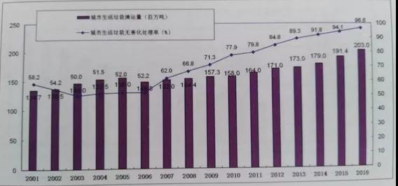 從1979年開始,隨著我國城市化的進程,到2016年,我國城市化垃圾已經到達兩億噸??梢钥吹剑覈鞘欣臒o害化處理在2016年已經接近100%,可以說我國城市垃圾的無害化處理取得的成績還是非常顯著的。