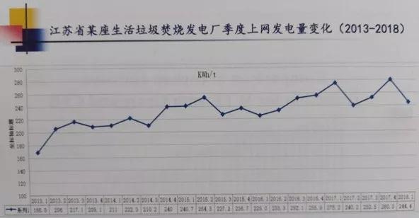 中國的生活垃圾水分比較高,一般在垃圾池中放七天左右,使大部分水分能夠析出。這樣使垃圾不僅好燒,還能用于發(fā)電。在世界范圍內,中國的焚燒處理工藝還是比較高的。上圖是江蘇省某生活垃圾焚燒發(fā)電廠季度上網發(fā)電情況(2013-2018),這座焚燒廠采用的是爐排爐的工藝,可以看出,這幾年的發(fā)電情況呈逐年上升的趨勢。