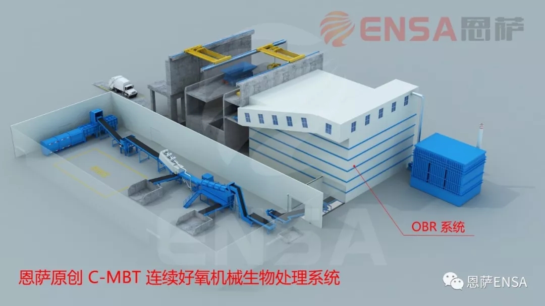 為解決上述問題,恩薩原創(chuàng)性地提出大規(guī)模智能連續(xù)好氧機(jī)械生物處理技術(shù)(以下簡(jiǎn)稱“C-MBT”,即:Continuous Mechanical Biological Treatment),即采用 OBR 連續(xù)高效好氧生物反應(yīng)器(恩薩專利)技術(shù)(以下簡(jiǎn)稱“OBR”, 即:Oxic Bio-Reactor ),針對(duì)已經(jīng)過初步破碎預(yù)處理后的生活垃圾等物料,在封閉的環(huán)境下,以連續(xù)進(jìn)出料和自動(dòng)翻拋的方式持續(xù)好氧發(fā)酵的過程,從而在相對(duì)較短的發(fā)酵時(shí)間內(nèi)持續(xù)獲得較低含水率的高熱值物料。