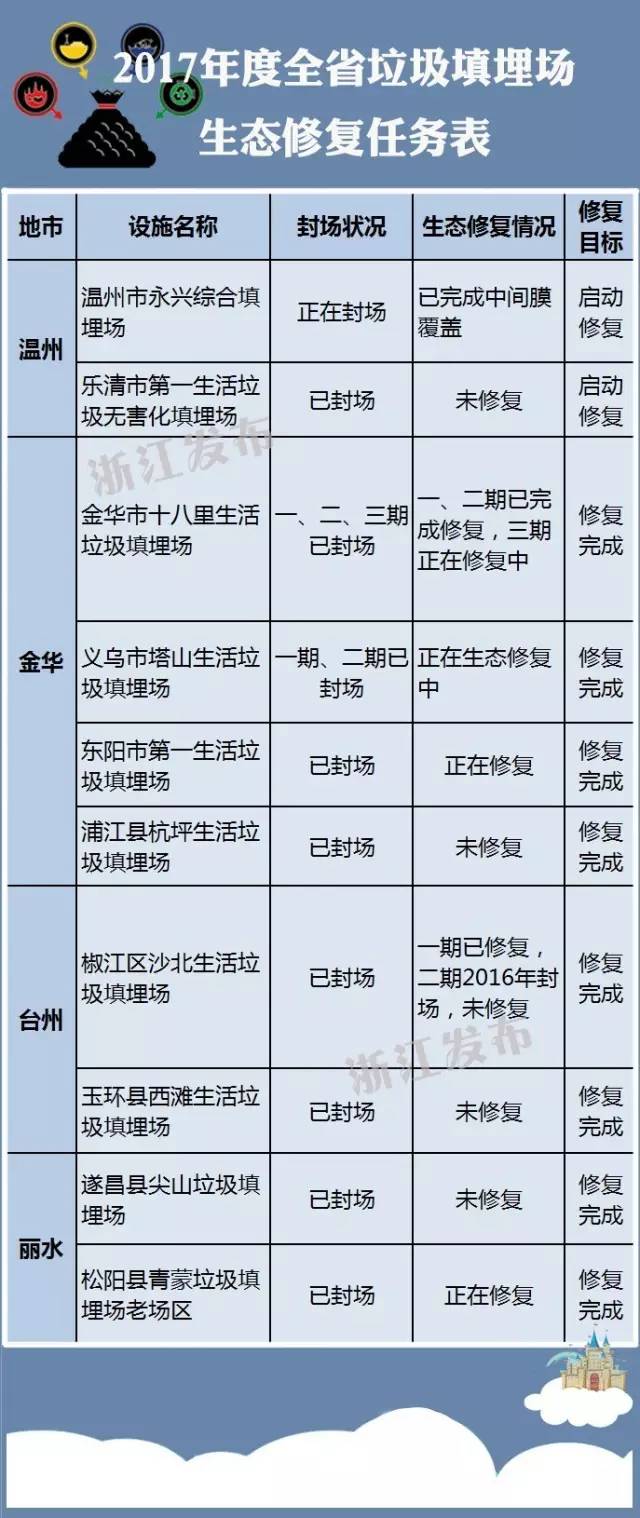 2017年全省計(jì)劃開展10個(gè)垃圾填埋場(chǎng)生態(tài)修復(fù)工程,浙江要通過這些垃圾填埋場(chǎng)的生態(tài)化改造,拆除環(huán)?!岸〞r(shí)炸彈”。具體名單↓