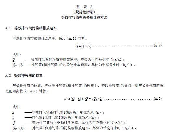 若有三根以上的近距排氣筒,且排放同一種污染物,應(yīng)以前兩根的等效排氣筒,依次與第三、第四根排氣筒取等效值。等效排氣筒的有關(guān)參數(shù)按附錄A 規(guī)定計(jì)算。