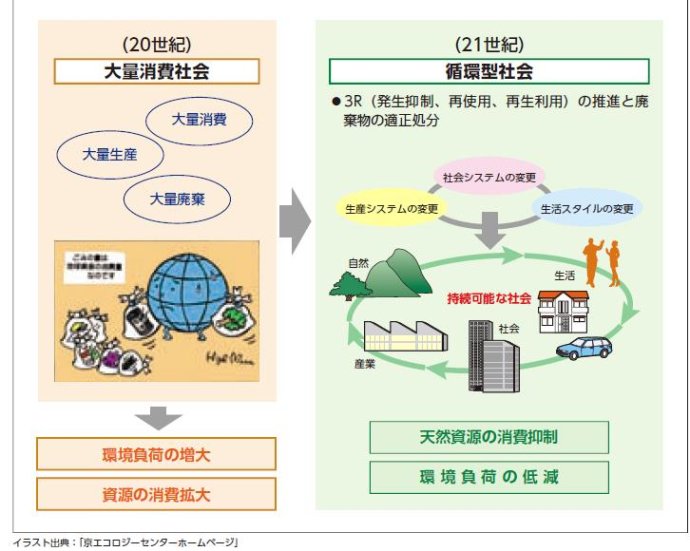 4)日本生活垃圾產(chǎn)生量的下降不是因為垃圾分類,而是改變消費模式。1997年到2007年是日本生活垃圾分類收集全面實施的10年,生活垃圾回收利用率從1997年11%提高到2007年20.3%,但生活垃圾的產(chǎn)生量并沒有明顯下降,1997年到2000年期間還有所增長,2000年達(dá)到最高值,2000年后開始有所下降,由人均生活垃圾日產(chǎn)生量1.132千克下降到0.90千克(2014年),巧合的是日本建設(shè)循環(huán)型社會的基本法正是從2000年開始實施的,有關(guān)建設(shè)循環(huán)型社會的要求明確要改變消費模式,即改變大量生產(chǎn)、大量消費、大量廢棄的模式(見下圖),明確提出抑制消費,減輕環(huán)境負(fù)荷;換句話說,減少消費才是減少社會垃圾產(chǎn)生的有效途徑。當(dāng)前,我國要真正實現(xiàn)生活垃圾減量,宏觀上就需要抑制消費,我們從思想上、心底里、現(xiàn)實條件中準(zhǔn)備好了嗎!想起一次會議上,來自歐洲的專家講,現(xiàn)代的綠色城市標(biāo)志是居民出行騎自行車;我與他們說,按照這樣的條件,在我國上世紀(jì)七十年代、八十年代許多城市都滿足這樣的條件,但顯然這不是大家所希望的。如今在歐洲等發(fā)達(dá)國家倡導(dǎo)綠色、低碳理念,提倡自行車出行符合這樣的理念當(dāng)然是正確的,但他們是在家家有車甚至人人有車的基礎(chǔ)上鼓勵少開車、多用自行車出行;如今我國正在邁入小汽車時代,交通擁堵已經(jīng)成為“城市病”特征,盡管如此,如果我們對一個還沒有開個車正在夢想擁有自己小汽車的人,去宣導(dǎo)少開車、不開車,為了綠色與低碳,他不認(rèn)為這樣的宣導(dǎo)是“有病”,也會認(rèn)為是可笑的。經(jīng)歷改變行為,釋迦摩尼曾經(jīng)是印度王子,在金錢、美女都有充分體會才去普度眾生。我們大多數(shù)人還奔跑在全面小康的路上,雖然部分人確實先富起來,但他們通過各類影視告訴大眾,什么是有錢人,有錢人吃剩了就扔,不會放在冰箱里;就是一些聲稱注重環(huán)保的名人代言環(huán)保廣告也公開呼吁喝小瓶裝的瓶裝水(為了減少浪費為未喝完的水,忘記了忽略了把未喝完的水帶著繼續(xù)喝),這與發(fā)達(dá)國家為減少包裝垃圾提倡喝大瓶裝的瓶裝水截然相反。千方百計擴(kuò)大消費、想盡辦法誘導(dǎo)消費仍然是主旋律,耳邊又響起央視“小罐茶”的廣告……