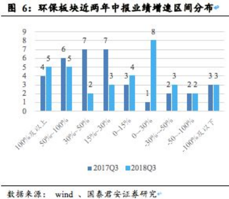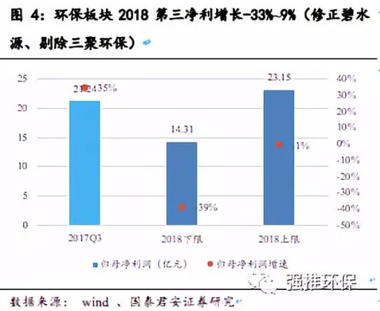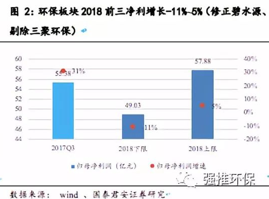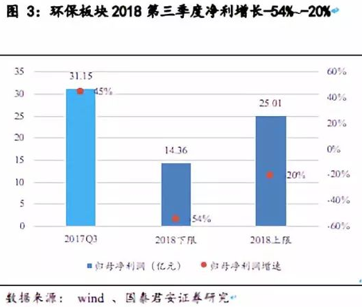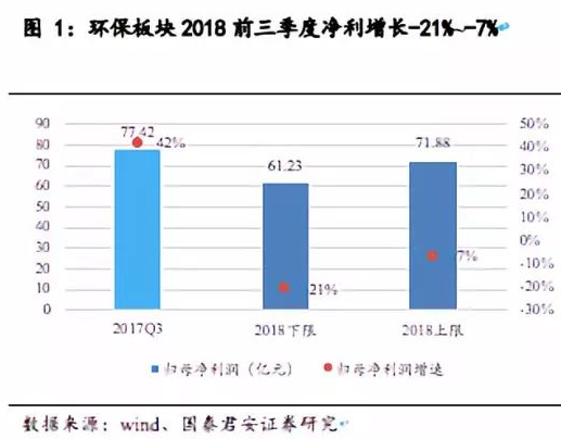 截至2018年10月21日,環(huán)保板塊共有35家上市公司披露業(yè)績預告/三季報,凈利潤合計61.23~71.88億元,增速在-21%~-7%之間,同比2017Q3時42%的業(yè)績增速,呈急轉直下態(tài)勢。剔除個別主業(yè)與環(huán)保相關較弱標的,凈利潤同比增-11%~5%,較2017Q3增速31%依顯著下滑。