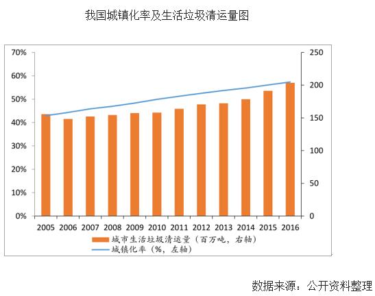 隨著城鎮(zhèn)化進(jìn)程加速,生活垃圾處理需求保持較快增長,垃圾清運(yùn)量持續(xù)增長,處理能力相對(duì)不足。2005年-2017年我國城鎮(zhèn)化率從42.99%提升至58.52%,城鎮(zhèn)化的快速發(fā)展和人民生活水平的日益提高使得我國城鎮(zhèn)生活垃圾清運(yùn)量持續(xù)較快增長。根據(jù)國家新型城鎮(zhèn)化規(guī)劃,到2020年,城鎮(zhèn)化率將提升至60%左右。伴隨城鎮(zhèn)化持續(xù)推進(jìn)以及人民。生活水平提升推動(dòng),預(yù)計(jì)城市生活垃圾產(chǎn)生及清運(yùn)量將持續(xù)。
