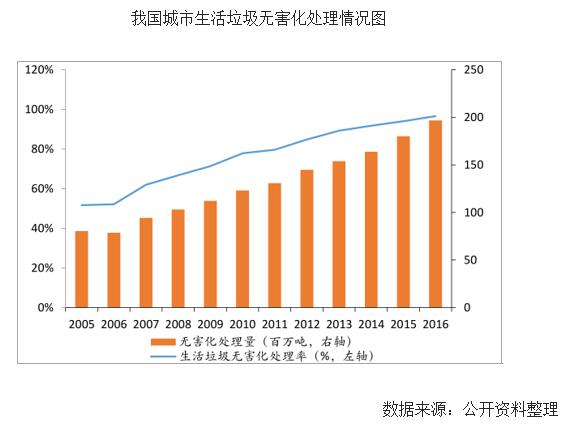 2017年1月,發(fā)改委頒布《“十三五”全國城鎮(zhèn)生活垃圾無害化處理設(shè)施建設(shè)規(guī)劃》。規(guī)劃提出,要加快垃圾無害化化處理設(shè)施建設(shè),到2020年底,直轄市、計(jì)劃單列市和省會(huì)城市(建成區(qū))生活垃圾無害化處理率達(dá)到100%;其他設(shè)市城市、縣城(建成區(qū))、建制鎮(zhèn)的生活垃圾無害化處理率分別達(dá)到95%以上、80%以上和70%以上。