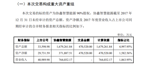 霞客環(huán)保11月5日晚間披露重大資產(chǎn)重組預(yù)案,公司擬通過重大資產(chǎn)置換及發(fā)行股份購買資產(chǎn)的方式,購買協(xié)鑫智慧能源90%股份。其中,公司擬置出資產(chǎn)作價2.69億元,協(xié)鑫智慧能源90%股份作價47.05億元,二者差額部分由公司發(fā)行股份購買,此次交易構(gòu)成重組上市。