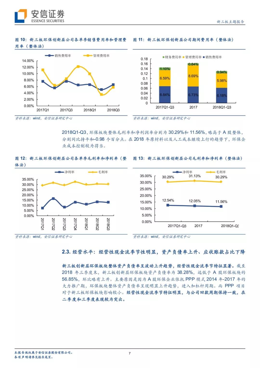 盈利能力:1)期間費用:新三板環(huán)保板塊2018年前三季度銷售、管理、財務(wù)費用率分別為6.18%、5.98%、0.94%,同比-0.66、-0.61、-0.16個百分點,銷售、管理費用率控制得當。財務(wù)費用率低于A股環(huán)保公司(A股為2%-3%),主要原因是因為A股以PPP為主要模式,2018年以來利率信用收緊、利率繼續(xù)上行。2)2018Q1-Q3,新三板環(huán)保板塊整體毛利率和凈利率為30.29%、11.56%,略高于A股整體,分別同比持平和-0.98個百分點。