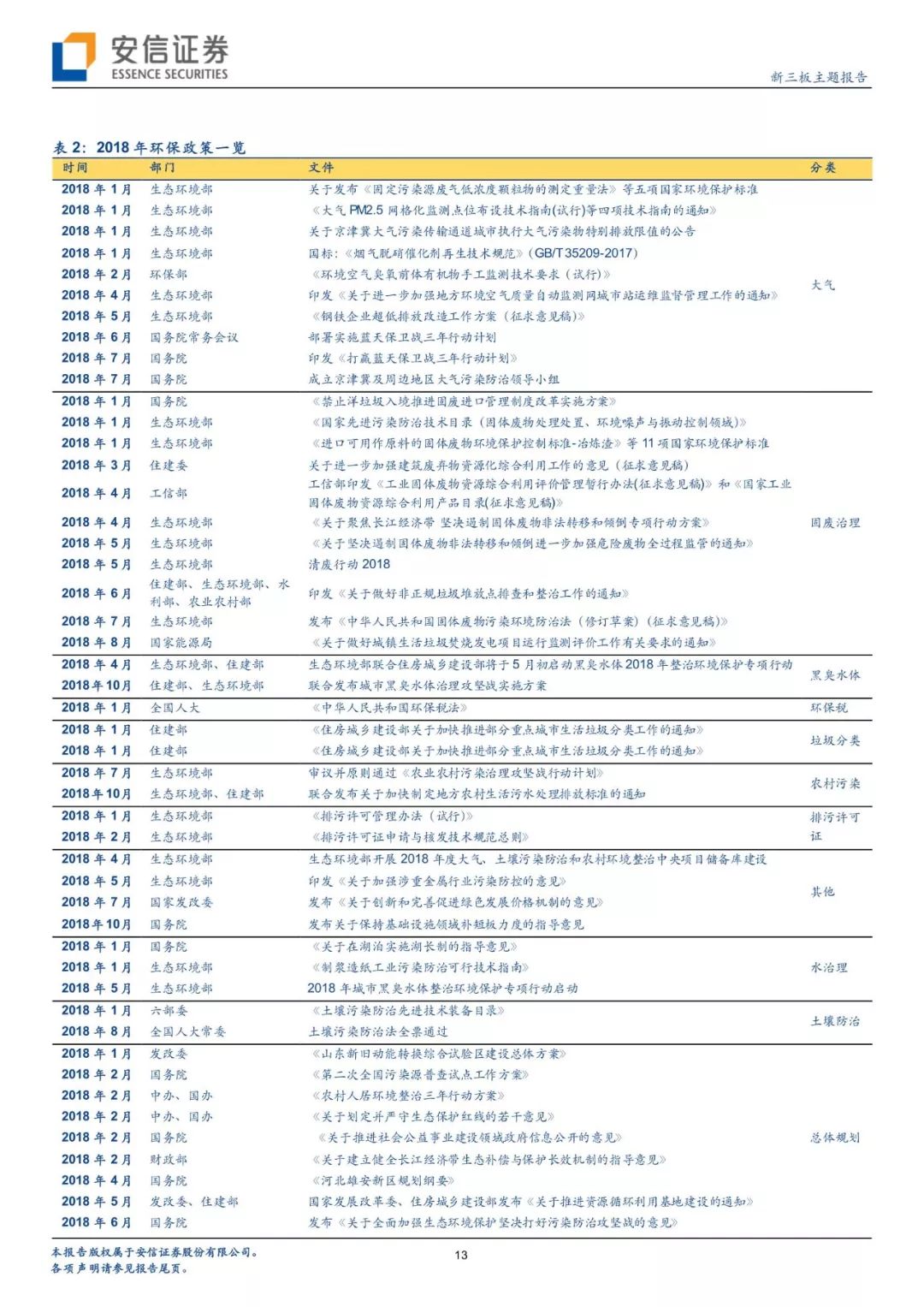 從政策進展看環(huán)境變遷路徑,環(huán)境治理已經(jīng)實現(xiàn)圍繞大氣+水+土壤三大維度建立起“環(huán)保稅+排污許可證”兩大保障、從城市走向農(nóng)村的一體化大環(huán)保格局。自年初環(huán)保稅、排污許可證實施以來,政策力度不減且頻頻出臺,在肯定我國環(huán)境治理已取得階段性的勝利的同時,進行大氣、水、固廢、土壤等細分領(lǐng)域的深化推進。我們對于2018年以來各細分板塊政策及變遷進行了梳理。而新三板擁有400家公司,覆蓋了大氣治理、水治理、固廢治理等各個領(lǐng)域。我們繼續(xù)看好環(huán)保板塊,建議從政策推進進程中發(fā)掘潛在機會,建議關(guān)注水治理、固廢治理和再生資源板塊投資機會。