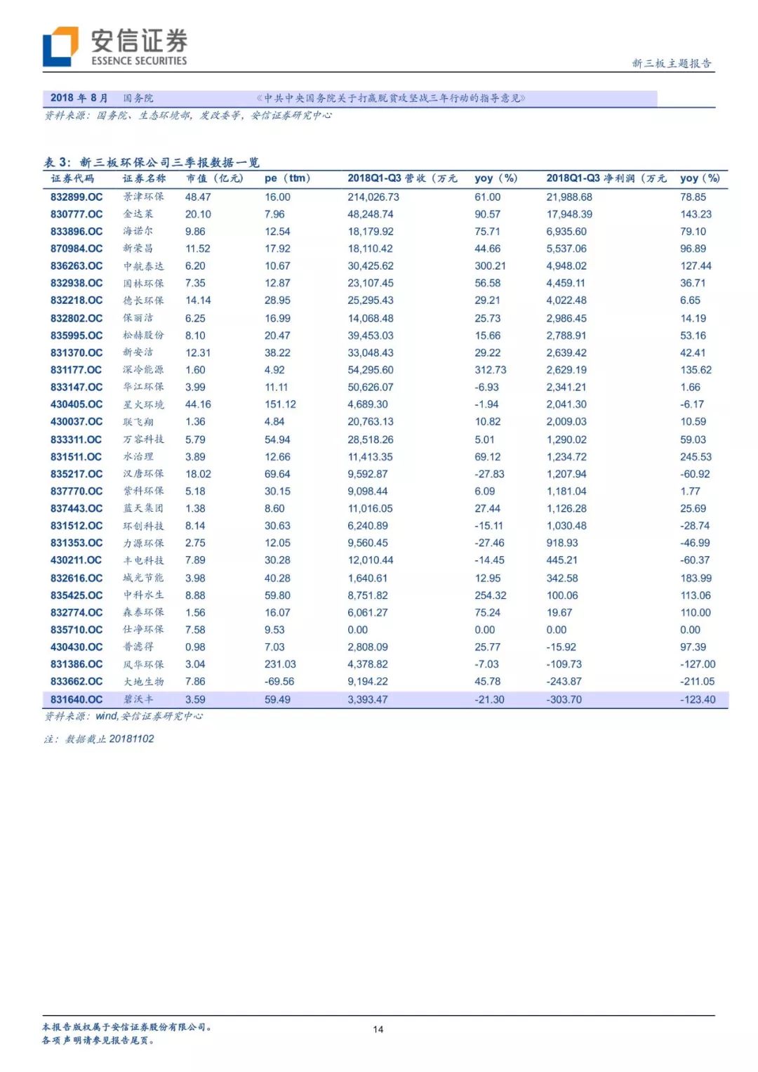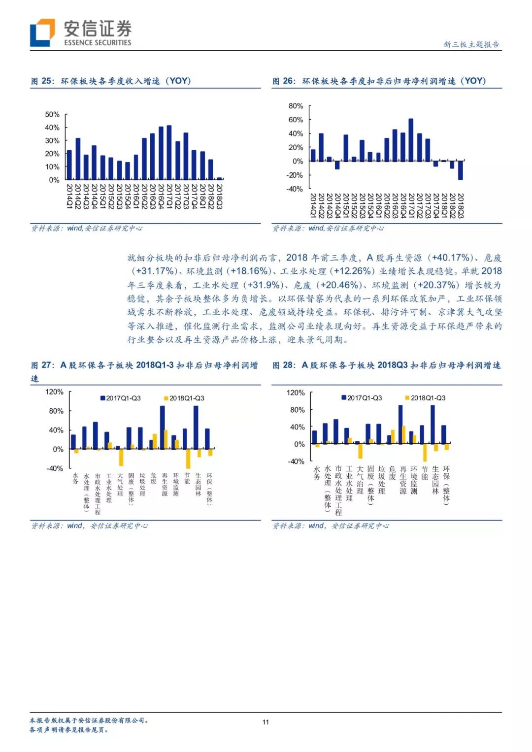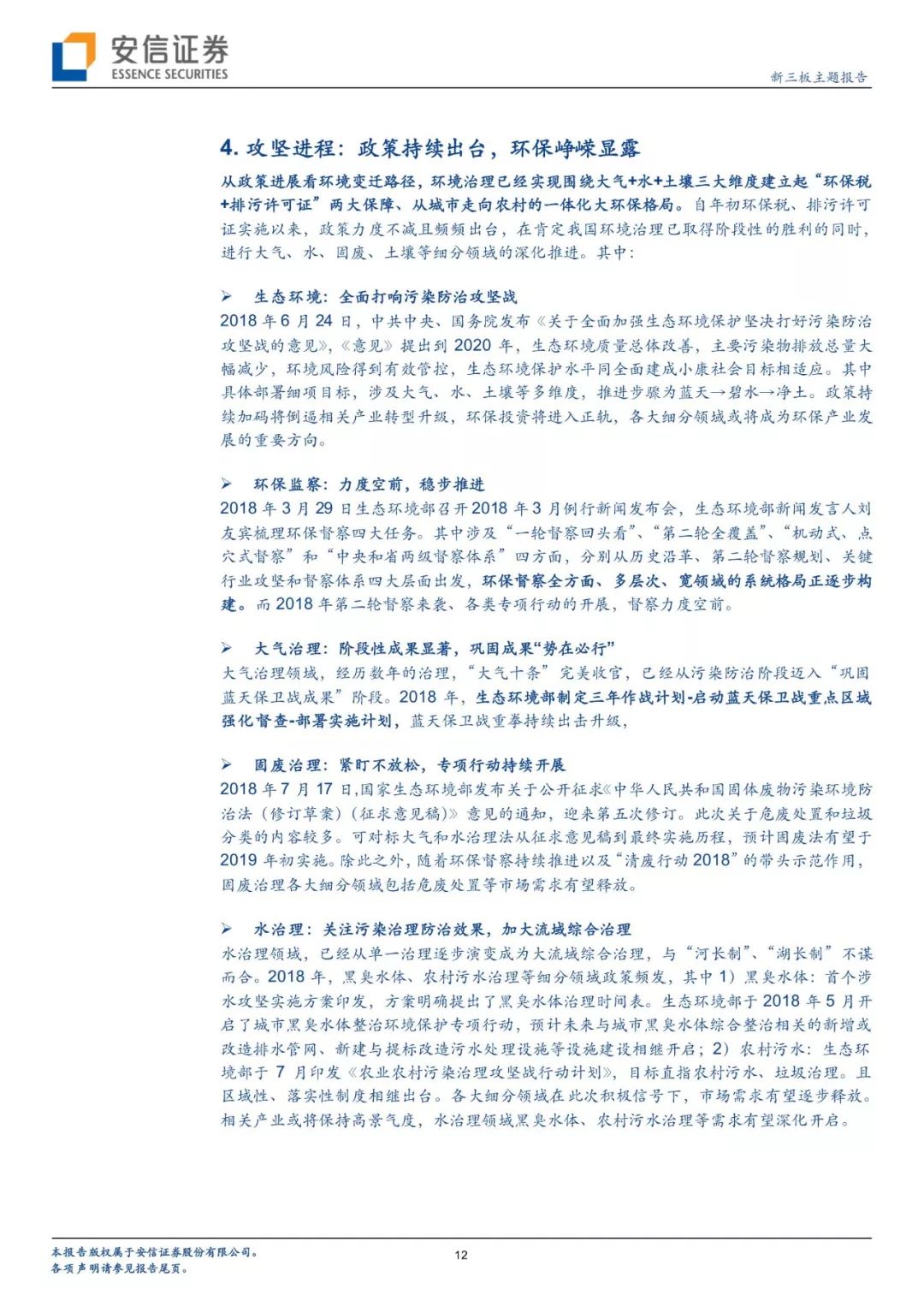 從政策進展看環(huán)境變遷路徑,環(huán)境治理已經(jīng)實現(xiàn)圍繞大氣+水+土壤三大維度建立起“環(huán)保稅+排污許可證”兩大保障、從城市走向農(nóng)村的一體化大環(huán)保格局。自年初環(huán)保稅、排污許可證實施以來,政策力度不減且頻頻出臺,在肯定我國環(huán)境治理已取得階段性的勝利的同時,進行大氣、水、固廢、土壤等細分領(lǐng)域的深化推進。我們對于2018年以來各細分板塊政策及變遷進行了梳理。而新三板擁有400家公司,覆蓋了大氣治理、水治理、固廢治理等各個領(lǐng)域。我們繼續(xù)看好環(huán)保板塊,建議從政策推進進程中發(fā)掘潛在機會,建議關(guān)注水治理、固廢治理和再生資源板塊投資機會。