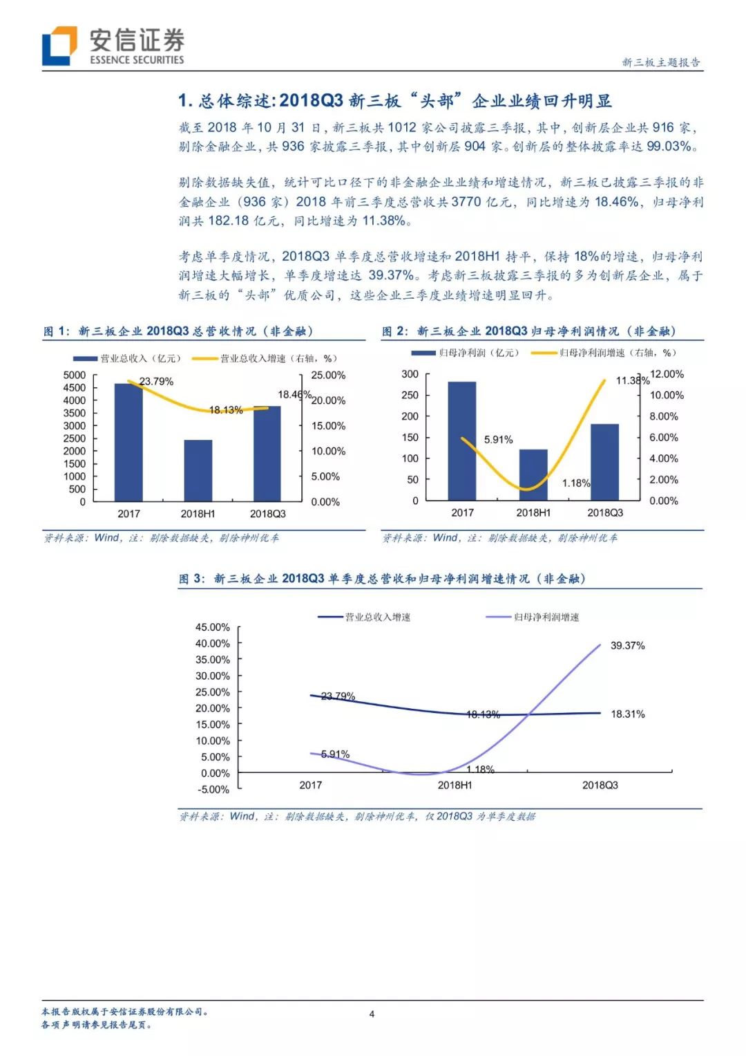 截至2018年10月31日,新三板共1012家公司披露三季報,創(chuàng)新層企業(yè)共916家,剔除金融企業(yè),共936家披露三季報(創(chuàng)新層904家)。剔除數(shù)據(jù)缺失值,可比口徑下的非金融企業(yè)(936家)2018年前三季度總營收共3770億元,同比增速為18.46%,歸母凈利潤共182.18億元,同比增速為11.38%。2018Q3單季度總營收增速和2018H1持平,保持18%的增速,歸母凈利潤增速大幅增長,單季度增速達39.37%。主要原因是創(chuàng)新層企業(yè)屬于新三板的“頭部”優(yōu)質(zhì)公司,這些企業(yè)三季度業(yè)績增速明顯回升。