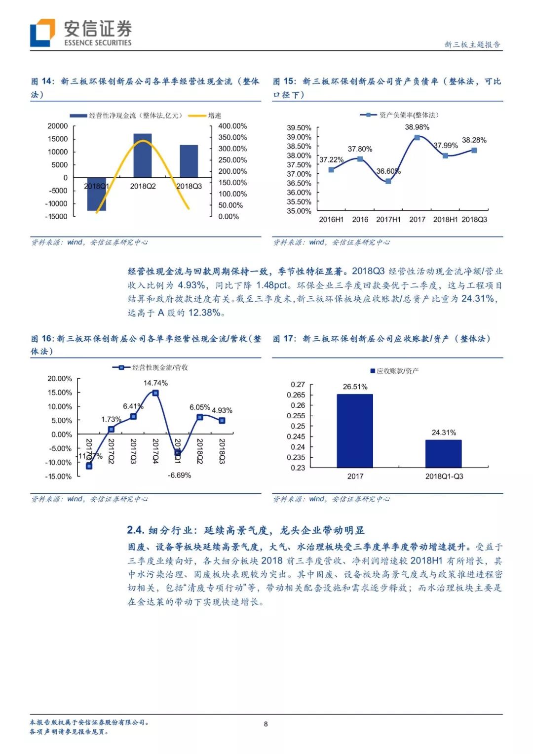 經(jīng)營水平:截至2018年三季度末,新三板創(chuàng)新層環(huán)保板塊資產(chǎn)負債率為38.28%,遠低于A股環(huán)保板塊的56.85%,主要原因是A股環(huán)保企業(yè)依托PPP模式,且2014年-2017年的大力推廣期,資產(chǎn)負債率呈現(xiàn)明顯上升,進入加杠桿周期,而PPP項目對于新三板環(huán)保板塊影響較小。經(jīng)營性現(xiàn)金流與回款周期保持一致,季節(jié)性特征顯著。2018Q3經(jīng)營性活動現(xiàn)金流凈額/營業(yè)收入比例為4.93%,同比下降1.48pct。環(huán)保企業(yè)三季度回款要優(yōu)于二季度,這與工程項目結(jié)算和政府撥款進度有關(guān)。截至三季度末,新三板環(huán)保板塊應(yīng)收賬款/總資產(chǎn)比重為24.31%,遠高于A股的12.38%,主要與新三板環(huán)保企業(yè)議價能力有關(guān)。