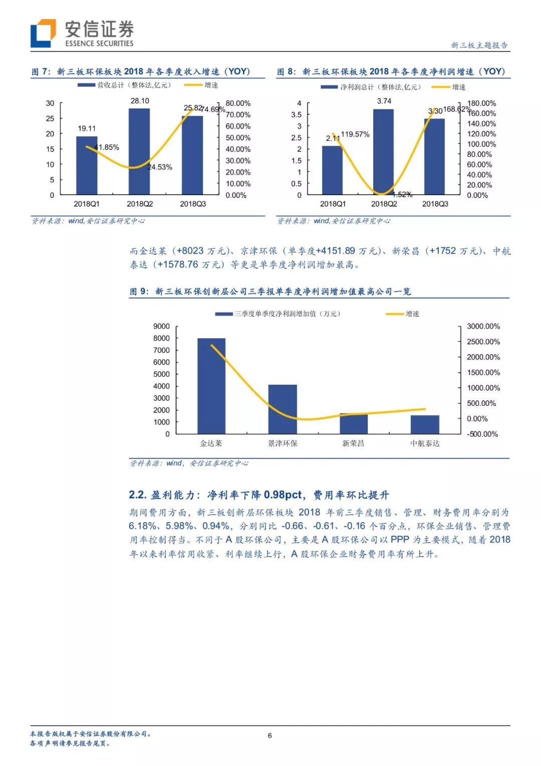 盈利能力:1)期間費用:新三板環(huán)保板塊2018年前三季度銷售、管理、財務(wù)費用率分別為6.18%、5.98%、0.94%,同比-0.66、-0.61、-0.16個百分點,銷售、管理費用率控制得當(dāng)。財務(wù)費用率低于A股環(huán)保公司(A股為2%-3%),主要原因是因為A股以PPP為主要模式,2018年以來利率信用收緊、利率繼續(xù)上行。2)2018Q1-Q3,新三板環(huán)保板塊整體毛利率和凈利率為30.29%、11.56%,略高于A股整體,分別同比持平和-0.98個百分點。