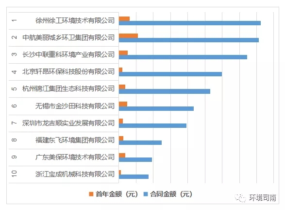 其中:“徐州徐工環(huán)境技術有限公司、中航美麗城鄉(xiāng)環(huán)衛(wèi)集團有限公司、長沙中聯(lián)重科環(huán)境產(chǎn)業(yè)有限公司、杭州錦江集團生態(tài)科技有限公司、深圳市龍吉順實業(yè)發(fā)展有限公司”等10家公司共中標17個項目,合同總金額49.53億元,中標項目首年服務費總金額4.34億元。