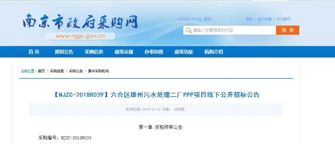11月13日,從南京市政府采購網(wǎng)獲悉,六合區(qū)雄州污水處理二廠PPP項(xiàng)目發(fā)布招標(biāo)公告,總投資62097.17萬元。
