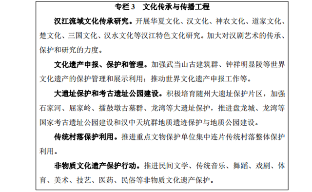 加強文化傳承與傳播。開展文化遺產(chǎn)的調(diào)查,建立漢江歷史文 化遺產(chǎn)保護傳承數(shù)據(jù)庫,做好世界文化遺產(chǎn)的申報、保護與管理, 推進大遺址保護和考古遺址公園建設(shè),對丹江口庫區(qū)淹沒區(qū)瀕危文 物實施搶救保護。加強歷史文化名城、名鎮(zhèn)、名村的保護,有條件 的地區(qū)實行連片保護和適度開發(fā)。推進革命文物和水下文化遺產(chǎn)保 護。加強非物質(zhì)文化遺產(chǎn)的挖掘與保護,深入開展傳統(tǒng)文化研究, 挖掘優(yōu)秀傳統(tǒng)文化的歷史淵源、時代內(nèi)涵和現(xiàn)實價值。聯(lián)合開展?jié)h 江文化旅游節(jié)等特色節(jié)慶活動,打造文化活動品牌。