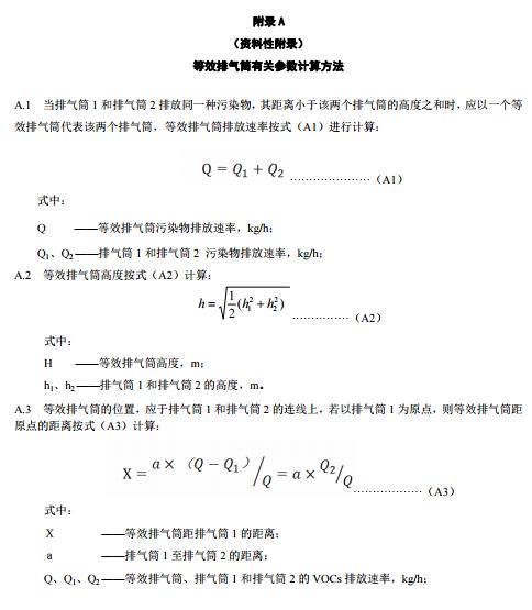 4.3.3兩個(gè)排放相同污染物的排氣筒,若其距離小于其幾何高度之和,應(yīng)合并并視為一根等效排氣筒。有三根以上的近距離排氣筒,且排放同一種污染物,應(yīng)以前兩根的等效排氣筒,依次與第三、第四根排氣筒取等效值。三根以上排氣筒計(jì)算等效高度時(shí),應(yīng)選取不同等效順序計(jì)算的等效高度值中的最小值作為等效排氣筒高度。等效排氣筒有關(guān)參數(shù)的計(jì)算公式參見(jiàn)附錄B。