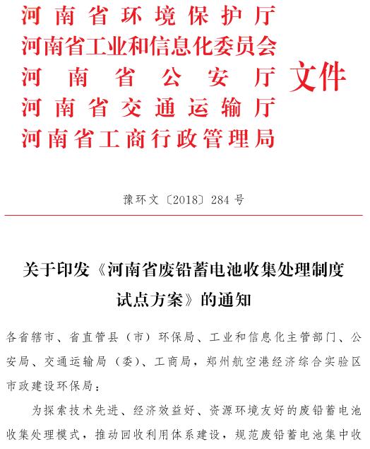 為貫徹落實 《中華人民共和國固體廢物污染環(huán)境防治法》、《危險廢物經營許可證管理辦法》和國務院辦公廳 《生產者責任延伸制度推行方案》 (國辦發(fā) 〔2016 〕 99 號),探索技術經濟性強、資源環(huán)境友好的多元化廢鉛蓄電池收集處理模式,推動回收利用體系建設,按照 《省委全面深化改革領導小組 2018 年工作要點》(豫改發(fā) 〔2018 〕 2 號)、 《 2018 年河南省生態(tài)文明體制改革實施方案》 (豫環(huán)委辦 〔2018 〕 14 號)要求,結合河南實際,制定本方案。