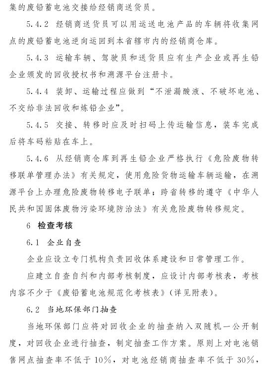 在試點市范圍內,廢鉛蓄電池在收集網點和經銷商倉庫之間轉移,可使用鉛蓄電池貨物運輸車輛轉運,廢鉛蓄電池自經銷商轉運至持危險廢物許可證的再生鉛企業(yè)、工業(yè)企業(yè)產生的廢鉛蓄電池集中轉運的,按照危險廢物進行管理,運行危險廢物轉移聯(lián)單,遵守危險貨物運輸管理有關規(guī)定??缡∞D移廢鉛蓄電池的,應當經移出地和移入地省級環(huán)保部門批準。
