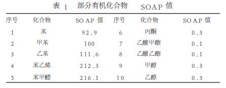 揮發(fā)性有機(jī)化合物(VolatileOrganicCompounds,簡稱VOCs)一般指沸點(diǎn)低于250℃的化學(xué)物質(zhì),是最為常見的大氣污染物,其主要來源于化工、制藥、石油、皮革、噴涂等行業(yè)排放的有機(jī)溶劑廢氣,包含脂肪烴、鹵代烴、硫烴、芳香烴、有機(jī)酸等。這些有機(jī)廢氣不但對(duì)環(huán)境質(zhì)量、人體健康、動(dòng)植物生產(chǎn)等造成極大的直接危害,且在光氧化反應(yīng)下,易形成二次有機(jī)物氣溶膠(SecondaryOrganicAerosol,簡稱SOA),導(dǎo)致光化學(xué)煙霧、酸雨、霾和氣候變化等一系列環(huán)境問題的產(chǎn)生,這些揮發(fā)性有機(jī)廢氣在空氣中懸浮匯聚亦是導(dǎo)致PM2.5和PM10數(shù)值不斷上升的原因之一,因而如何削減這些揮發(fā)性污染物至關(guān)重要。Derwent等[1]一直致力于二次SOA的研究,他們通過二次有機(jī)氣溶膠生成潛勢(shì)(Seconda-ryOrganicAerosolPotential,簡稱SOAP)研究,對(duì)多達(dá)上百種揮發(fā)性有機(jī)化合物進(jìn)行SOAP計(jì)算,具體見表1。
