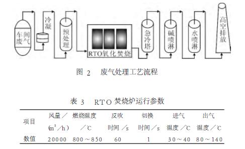 本文研究的RTO氧化焚燒裝置處理風(fēng)量設(shè)計(jì)為20000m3/h,處理工藝流程如圖2所示。廢氣經(jīng)過車間二級(jí)冷凝回收部分有機(jī)溶劑,再進(jìn)入預(yù)處理堿噴淋,吸收無機(jī)廢氣和水溶性廢氣,進(jìn)入RTO進(jìn)行氧化焚燒,先進(jìn)入急冷塔冷卻,最終通過堿、水處理后于15m高空排放。RTO焚燒爐運(yùn)行參數(shù)見表3