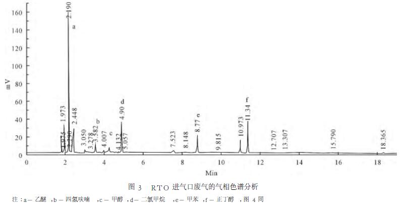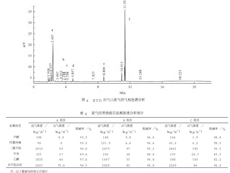以正丁醇作內(nèi)標(biāo)物,檢測(cè)廢氣中乙醚、四氫呋喃、甲醇、二氯甲烷、甲苯共5種組分含量,通過標(biāo)準(zhǔn)樣品分析,確定各個(gè)組分停留時(shí)間,結(jié)果見圖3和圖4。由圖可見,對(duì)各組分出峰面積進(jìn)行校正,甲醇進(jìn)氣濃度188mg/m3,經(jīng)RTO氧化焚燒后,甲醇出氣濃度降至9.8mg/m3,削減率94.8%;四氫呋喃進(jìn)氣濃度121.9mg/m3,經(jīng)氧化焚燒后,出氣濃度降至6.6mg/m3,削減率94.6%;二氯甲烷進(jìn)氣濃度2079mg/m3,經(jīng)氧化焚燒后,出氣濃度降至97mg/m3,削減率95.3%;同樣,甲苯和乙醚削減率分別達(dá)88.0%和96.8%,且排放濃度滿足《大氣污染物綜合排放標(biāo)準(zhǔn)》(GB16297-2012)。