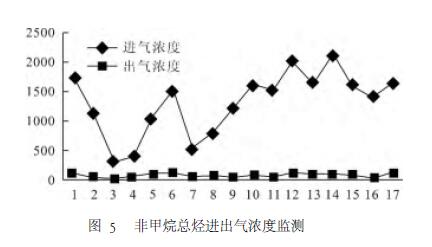 為考察RTO運(yùn)行性能穩(wěn)定性,運(yùn)行持續(xù)對(duì)該設(shè)備跟蹤研究半個(gè)多月,并將RTO進(jìn)出口非甲烷總烴監(jiān)測(cè)濃度進(jìn)行匯總,研究發(fā)現(xiàn)RTO對(duì)總有機(jī)廢氣的削減效率達(dá)95%以上,具體見圖5。