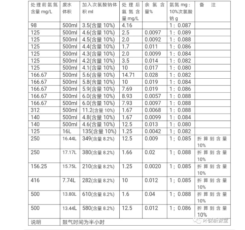 1.根據(jù)實(shí)驗(yàn)數(shù)據(jù)可看出,按氨氮重量mg:10%次氯酸鈉重量g=1:(0.08~0.088)時(shí)都可以使氨氮達(dá)標(biāo),但在1:0.088時(shí)處理效果最好,鼓氣半小時(shí)情況下氨氮除至最低值,且余氯含量低。