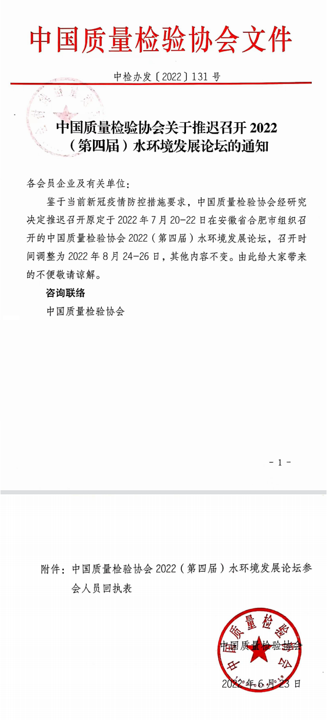 中國(guó)質(zhì)量檢驗(yàn)協(xié)會(huì)關(guān)于推遲召開(kāi)2022(第四屆)水環(huán)境發(fā)展論壇的通知各會(huì)員企業(yè)及有關(guān)單位: 鑒于當(dāng)前疫情防控措施要求,中國(guó)質(zhì)量檢驗(yàn)協(xié)會(huì)經(jīng)研究決定推遲召開(kāi)原定于2022年7月20-22日在安徽省合肥市組織召開(kāi)的中國(guó)質(zhì)量檢驗(yàn)協(xié)會(huì)2022(第四屆)水環(huán)境發(fā)展論壇,召開(kāi)時(shí)間調(diào)整為2022年8月24-26日,其...
