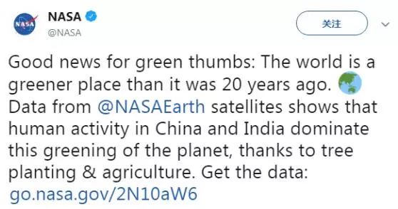 NASA稱,中國和印度的行動主導(dǎo)了地球變綠。▲NASA推特截圖2月12日,美國國家航空航天局(NASA)在社交媒體上發(fā)文稱,“好消息:相比20年前,世界變得更‘綠色’了。‘NASA地球’的衛(wèi)星顯示,發(fā)生在中國和印度的人類活動主導(dǎo)了這次地球變綠,感謝植樹造林和農(nóng)業(yè)種植?!盢ASA官網(wǎng)文章介紹,地球現(xiàn)在...
