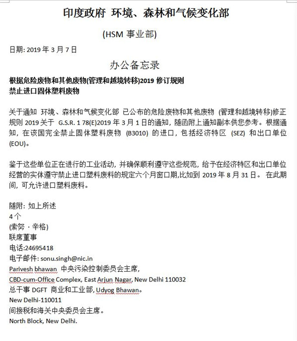 3月13日,本網(wǎng)報道了《印度宣布將全面禁止進(jìn)口固體塑料廢物》?!敖沼《拳h(huán)境、森林和氣候變化部發(fā)布一份官方聲明,稱印度政府已發(fā)布禁令,禁止印度(包括經(jīng)濟(jì)特區(qū)和出口型企業(yè))進(jìn)口固體塑料廢棄物。不過該聲明尚未透露這一禁令何時正式生效?!庇《日?環(huán)境、森林和氣候變化部(HSM事業(yè)部)日期:2019年3月...