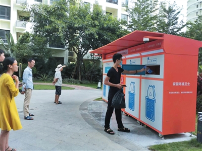居民正在使用智能垃圾分類柜投放垃圾。符吉茂 攝“既環(huán)保,又能換錢,還能提高我們的垃圾分類意識和分類正確率,一舉多得,這個智能垃圾分類柜值得點贊?!?月26日,家住崖州區(qū)保利·崖州灣小區(qū)居民候東將一個礦泉水瓶投進“大胃貓”智能垃圾分類柜后笑著說。日前,為助力三亞市生活垃圾分類工作,建設(shè)“無廢城市”,崖...